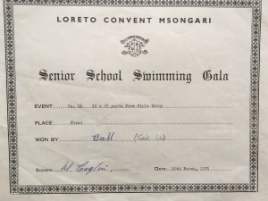 Juliet had her swimming gala at school last week and collected another certificate by being in the winning relay team (teams were by house – Juliet was in Ball). We all went to watch and had an enjoyable afternoon. The nuns provided tea and cakes for us and there was an ice-cream man in situ. The microphone was handled by an enormous African woman with glasses and a deep contralto voice – we were much amused to discover she was the Head Girl ! She certainly exuded authority !