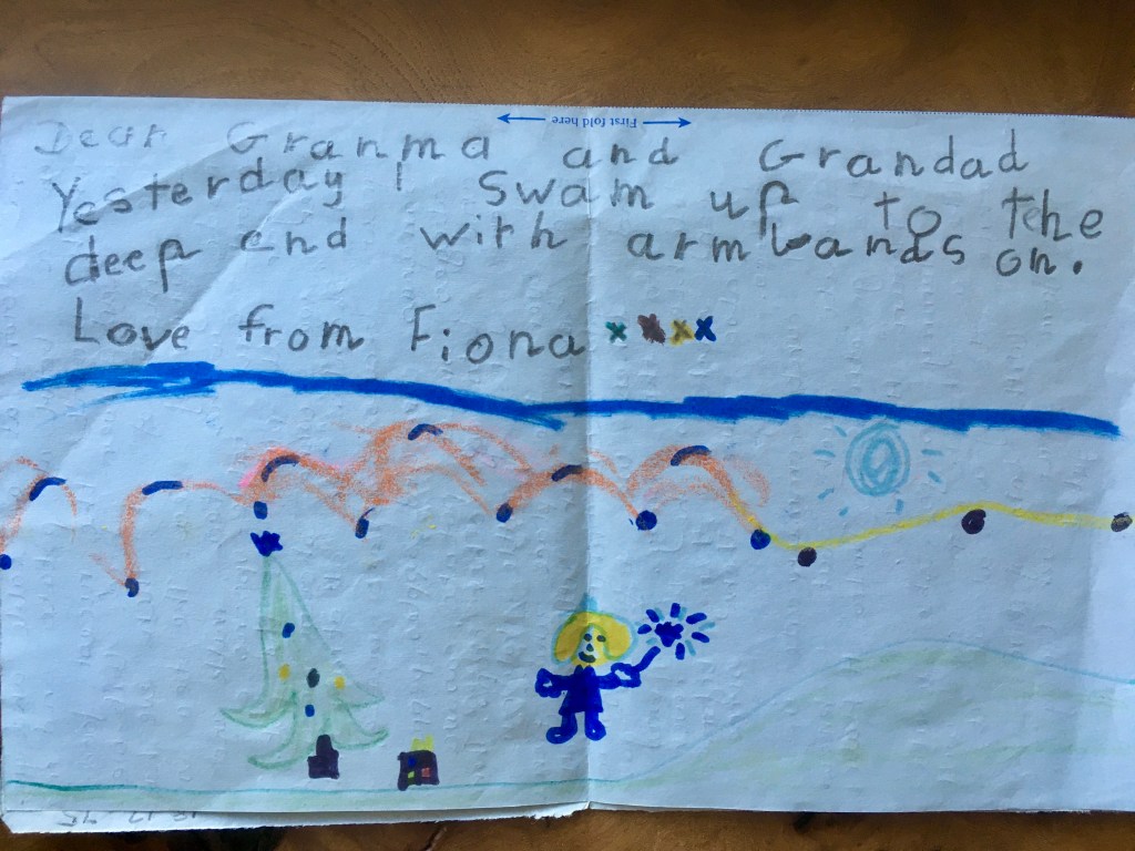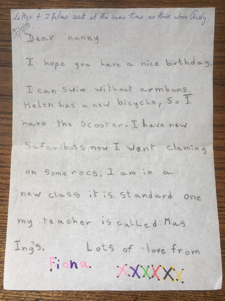 Fiona’s letter to you looks as if it has been used to scrub the floor – also her attempts at joined-up writing are not entirely successful ! However she was most hurt when I suggested she should rewrite it so here it is !