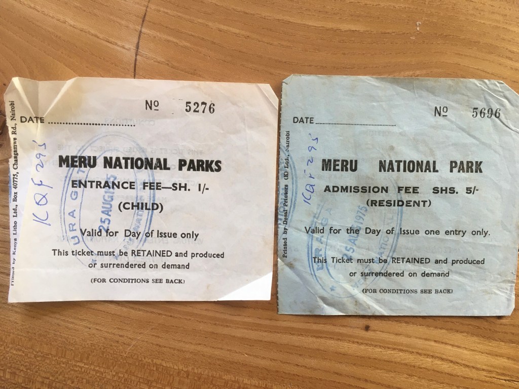 It is now the school holidays (we go back on 9th Sept) and I am sitting by a camp fire now in a campsite in Meru National Park. It is great up here. It’s the evening and the insects are singing, the fire is crackling and the wind blowing in the trees. It’s a super campsite beside a dried up river where lots of vervet monkeys play. This is our third night here and it has been very hot. Mummy is in her bikini now. It has been clear every night and I have been able to see the Milky Way and billions of other stars. We are NE of Mt Kenya although we haven’t seen it. On the journey from Nairobi we had trouble with the van – it was the points. Luckily it happened in Embu quite a big town. Before supper we were cooking potatoes in the fire and a monkey that I named Kiki (who had a big mole on the side of his lip) came and took one out and ate it while our backs were turned. The fire has been kept going ever since we arrived. This morning when I woke up I looked out of the window (Helen and I sleep in the van) and I saw lots of monkeys around a plastic bag. I rushed out with just a towel around me and frightened them away – Kiki rushed up a tree. They had been picking at empty tins. We saw lots and lots of kingfishers by our camp and I found a feather.