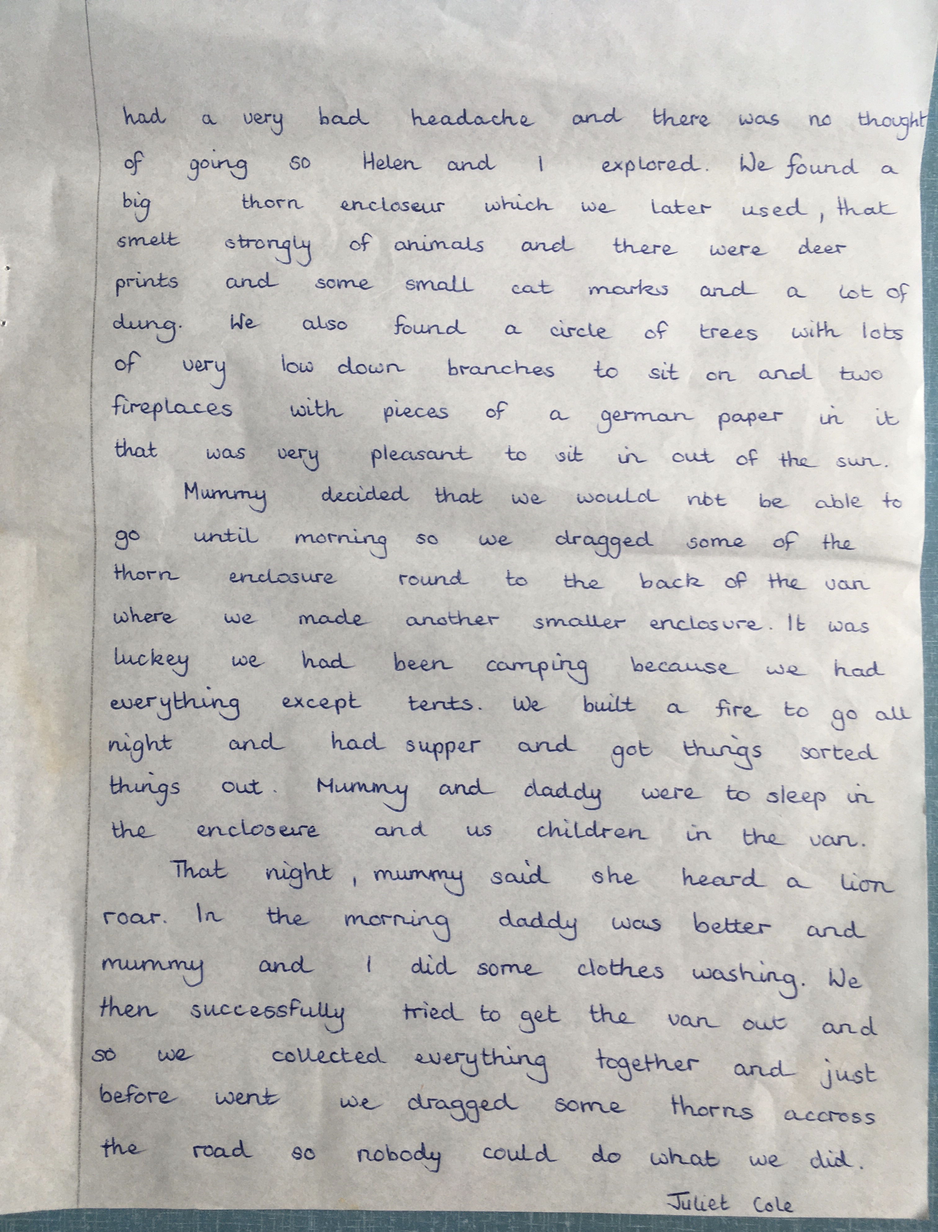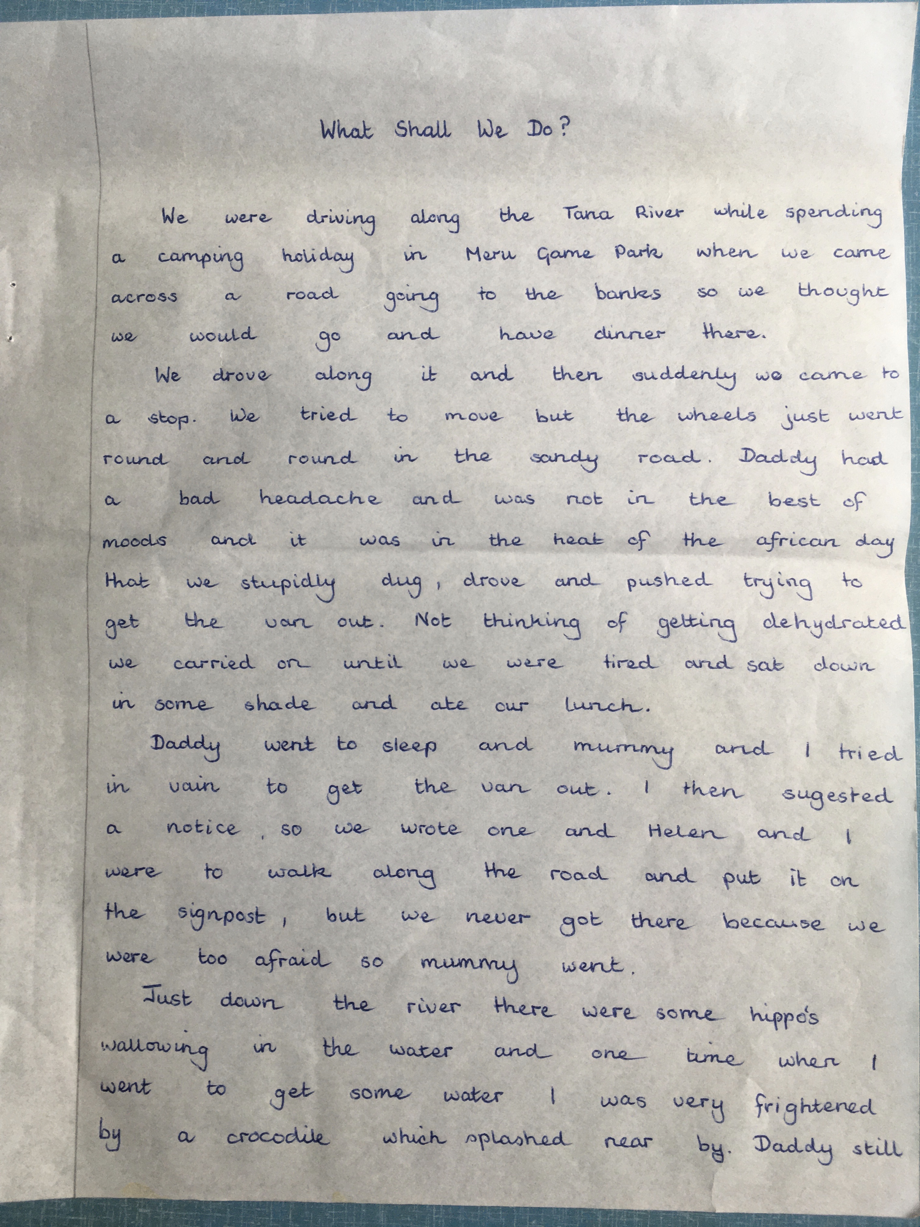 One day we were out for a drive and we went through a drift we must have gone over a big stone or something because we stopped quite soon and dad got out to look at the engine we found all the water had come out of the radiator so we got a bit of chewing gum that we luckily had with us and put in some water that we had in a water carrier we borrowed but it still leaked a lot after a while it stopped again so we put more water in, just then we noticed something moving in the bush it was a rhino (not a white one) chasing a lioness ! then they disappeared we decided to roll to the next drift then we got water and quickly drove to the Meru headquarters where we hoped that they could mend it they tried lots of things that took more than one hour they did quite a lot but it still leaks even now ! On the way back home we saw two cheetahs for about five minutes then they were gone. Another time we were driving along the bank of the river Tana and we saw three baby crocodiles and about two big crocodiles then we drove along a sand road and we got stuck it was a very nice picnic site then we tryed to get the van out of the sand but couldn’t so we had a cup of tea and had our supper for the night mum and dad slept in a thorn enclosure and us three slept in the van (it was lucky we had a big van because we had our food and sleeping bags), In the morning Juliet went to get water from the river and a crocodile swam up and she ran. We got out after a lot of pushing.