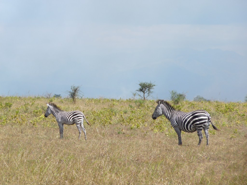 Meru Park was very large and also very pretty and very hot. We did not realise it would be so hot and Mummy had packed trousers and anoraks, but luckily also frocks and shorts. We saw three white rhinos out for a walk with two rangers. They came past our camp and one started coming towards us so one of the rangers shouted ‘kwenda!’ (go!) and the rhinos turned quickly and went. They must have been really tame. Later in the holiday we saw them again with tourists pulling their tails while they ate! The land around us was very changeable; sometimes you were on rolling golden plains, sometimes in dense green or grey bush land; whatever it was you could find animals and birds. There were lots of small rivers with fords. At these rivers we often found elephants. On ridges we found all sorts of animals but not elephants. On the plains with bushes we saw a lioness with a rhino, and on the way back to camp from there we saw two cheetahs. We often saw zebra, waterbuck, impala, ostrich, baboons and giraffes. The giraffes were reticulated which means the patterns on their skin are close together.