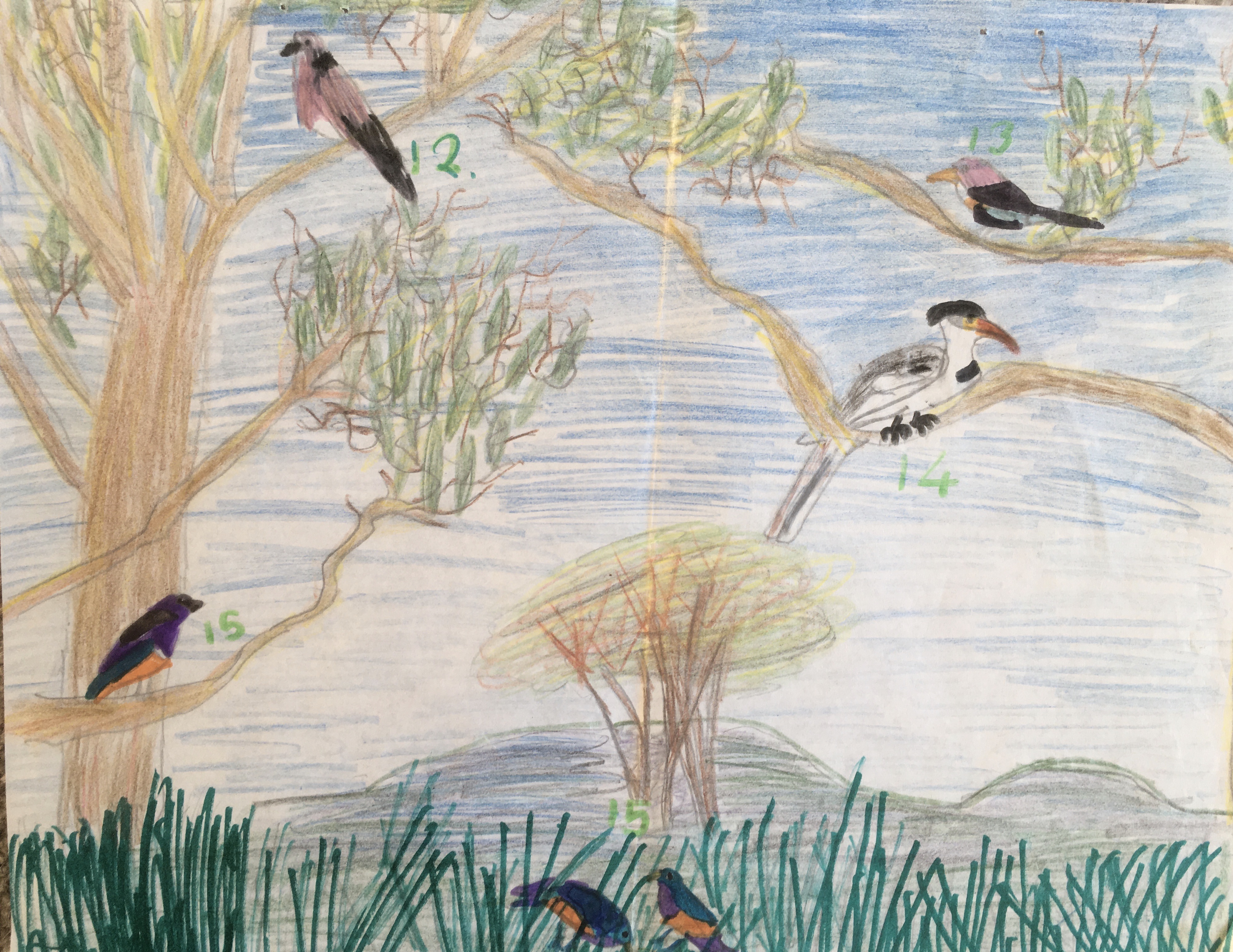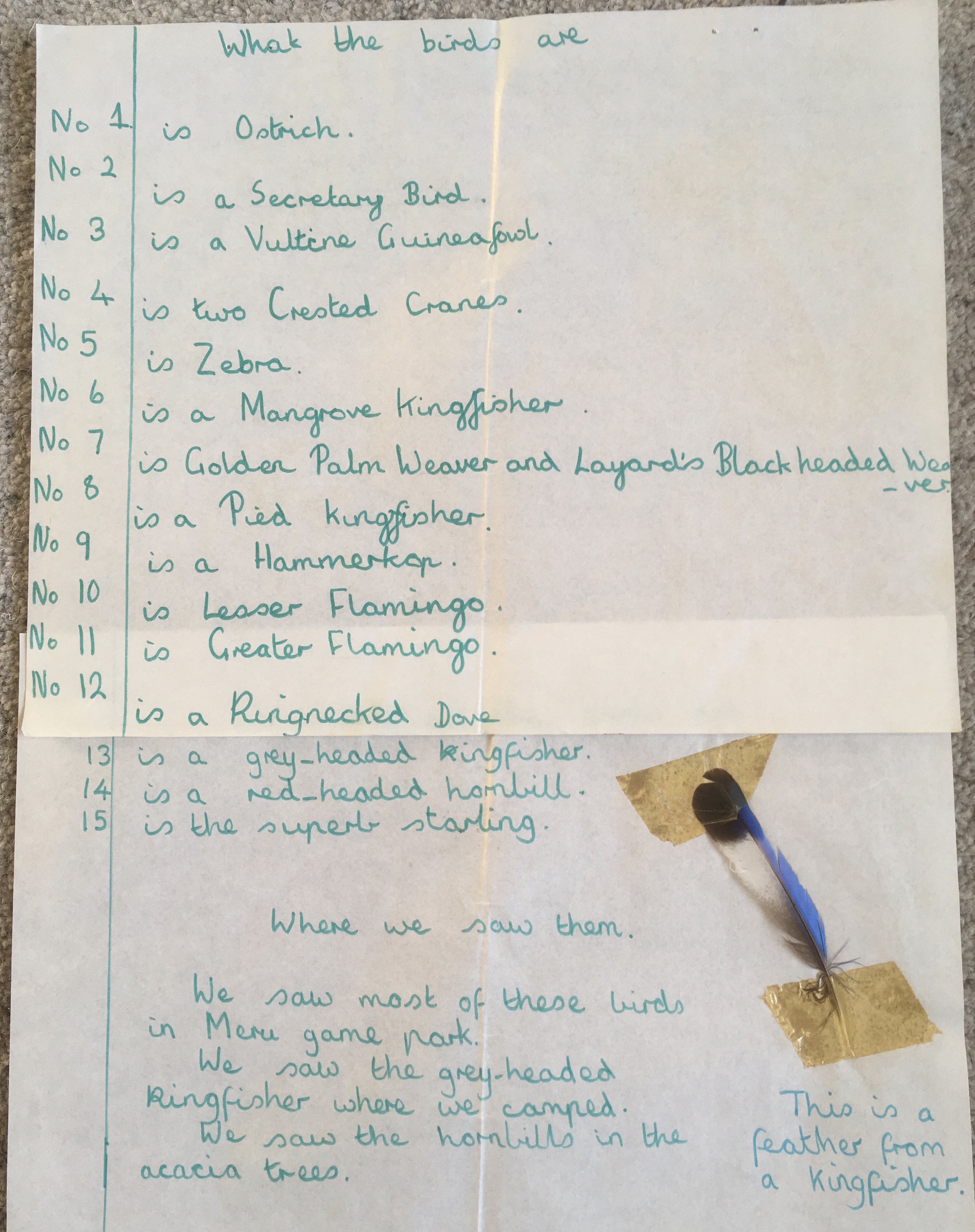 Although we are thousands of miles away at this moment we all hope you have a Happy Christmas and enjoy looking at these pictures of birds. Helen has done the birds of Kenya which are very good, Fiona has done a lovely animal picture and I have illustrated a poem you might know. We have also included two cine films which we hope and have no doubt you will enjoy.