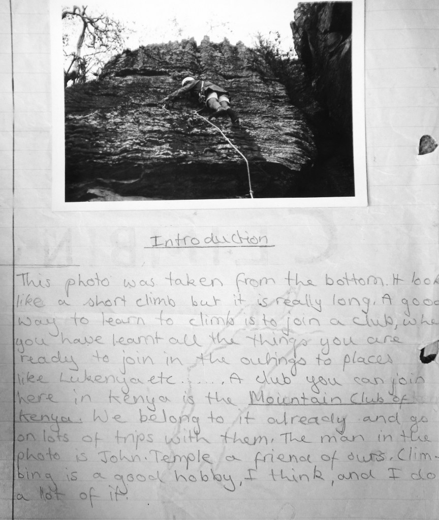I have let my conscience intrude sufficiently into my life to send you £20 for the rope. You must be rejoicing already; getting money for old rope ! It has proved useful as I expected. Last weekend I made my second climbing trip to Hell’s Gate and enjoyed a couple of routes. The harder one was ‘Vertigo’, with quite a hard first pitch. Mark Savage led it, for the second ascent as far as anyone knew. As there is a shortage of nuts and wedges here I have been making some out of brass. They look very pretty but are much heavier than aluminium. However they are not excessively heavy if drilled with holes (in the case of hexentrics). Doug Scott and his friend gave an interesting slide show last Friday at a well attended MCK meeting. I am terribly envious of people who can go to high altitude without being ill. Judy and I went up the Simion Track (on Mt Kenya) in August but didn’t get far past the Liki North Hut. There are perhaps more rock climbers going out frequently : the Asian lads are quite keen and will be glad to get some of my beautiful hardware.