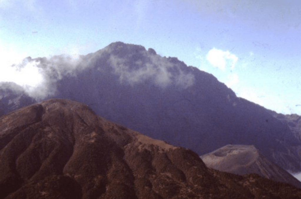 After our disappointment on Kilimanjaro John suggested some climbing on Mount Meru so we drove there in his little Toyota 4WD and paid to go into the National Park. John knew the roads in there and drove for miles to a high elevated plateau where we left the road to find an out-of-the-way place to camp. Camping wasn’t allowed in the park but we weren’t seen and we did no harm. We set off early next day and drove as near as possible to the base of a huge ash cone set within the caldera of the collapsed volcano which is Mt Meru. The climb was exhausting, up the steep sides of volcanic rock scree with nowhere to rest comfortably until we reached the rim where we rested after peering down into the depths and wondering when there would be another eruption. That was enough climbing for the day and we made our way down, ate a picnic lunch and returned to the car in the heat of the afternoon. There were plenty of animals in the park but we didn’t notice anything worrying until next day when buffaloes appeared near our footpath up to the main peak. We made a mistake that morning by taking a short cut from our campsite to the normal path up. We came to a very steep ascent through trees and shrubs and when this became almost vertical we had to scramble up, hanging on to trees and shrubs. Thus we made a very slow ascent and wished we had walked further to join the main path. After a close encounter with buffaloes which were around but hidden by giant heather on steep terrain we stopped for lunch and John worked out that we had lost so much time that going for the summit was probably unwise. I’m sure he’d been there before and our “illegal” trip up the cone had been an interesting success anyway. PLEASE NOTE that wandering on the mountain is actually dangerous and now, as then, one should go with an armed ranger for protection.