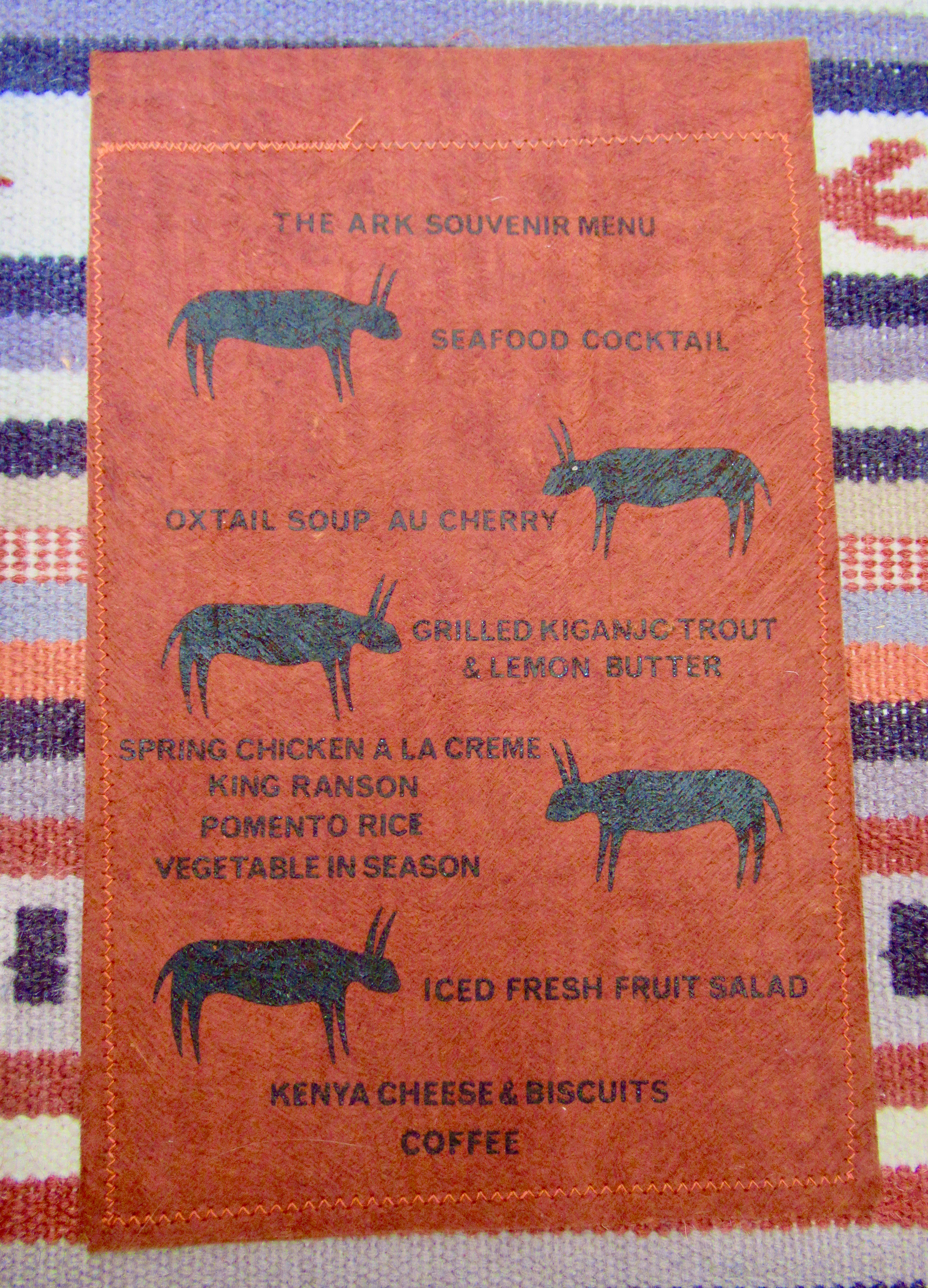 Last weekend I went to my friend Pamela’s house. On Friday her Dad went to play squash and he saw a very cheap offer for the Ark (a lodge). On Saturday morning at 11 o’clock we set off on our, I think, 120 mile journey. We went to the Aberdare Country Club first and had our lunch there. Afterwards we all piled in two buses and were driven to the Ark (I have sent you a postcard of it). Me and Pamela shared one room which overlooked the water. In the picture at the left-hand-side was a stone place which we called ‘the dungeon’ and on top of it the balconies over-looking the salt-lick. We had supper, dinner and breakfast there.