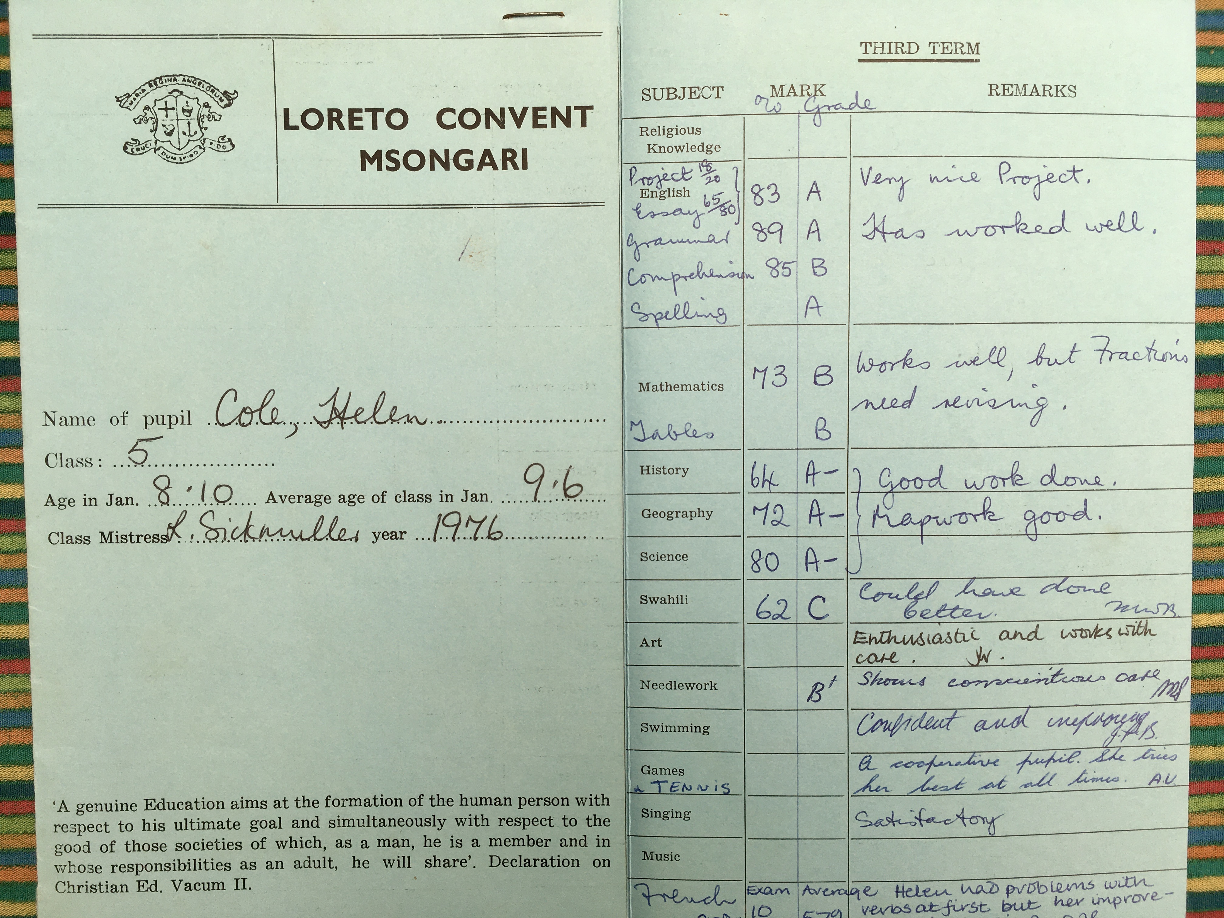 Helen’s school report from year end Standard 5 at Loreto Convent.