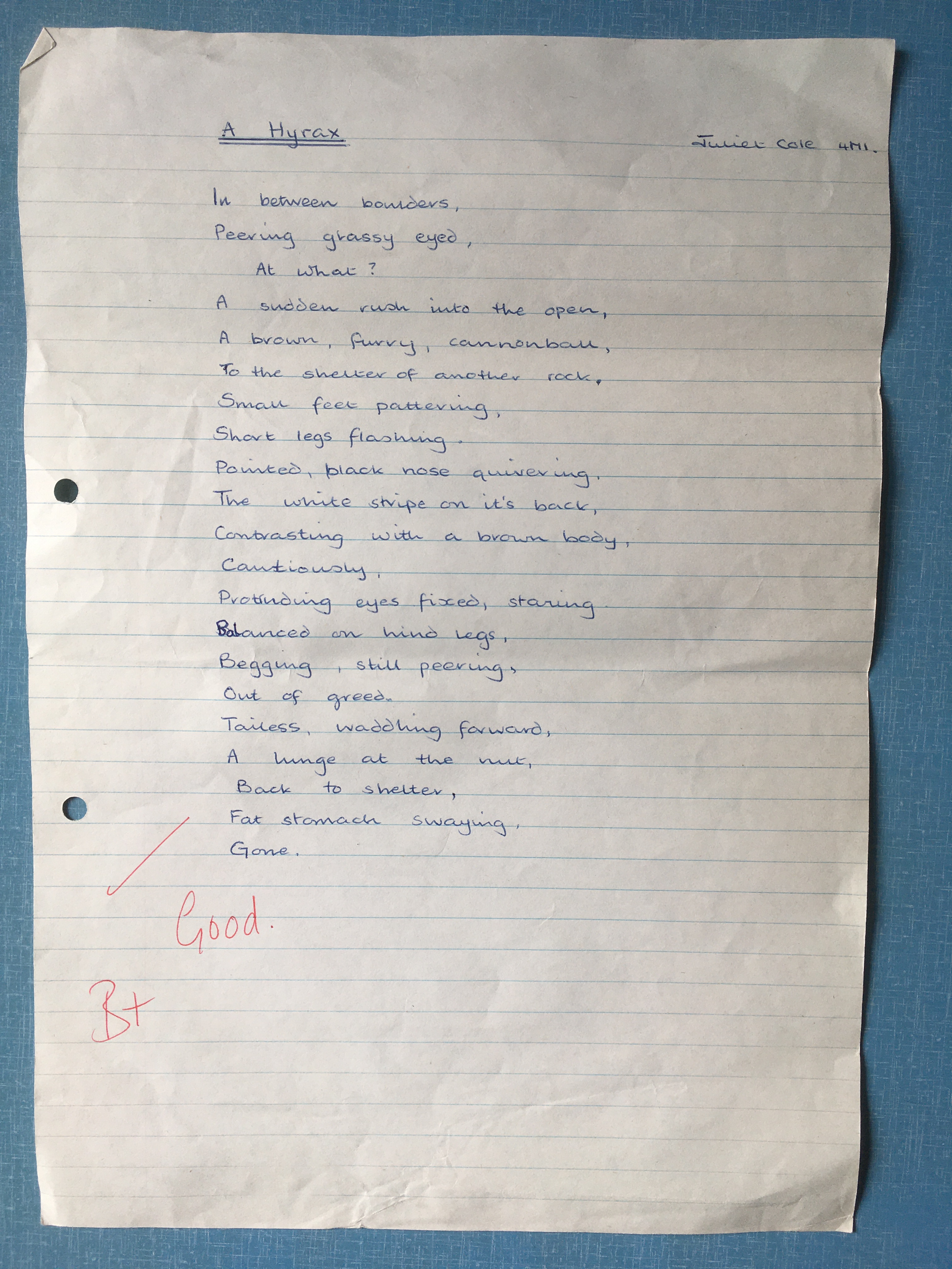 When looking through our archives I found a poem written by me for school homework in 1978 about a hyrax. It’s, as might be expected of a 15 year old, rather unremarkable so I didn’t intend to include it in this blog. However, Helen then asked me whether I had a copy of the hyrax poem, because if not, she did. How, when I’d written it? Because she had also submitted it as homework at school – she confessed she’d copied it from me, although whether I knew this at the time, or indeed suggested she copied it, is lost in the mists of time. But we rather like the story, so here are the two versions of the poem: