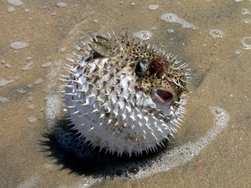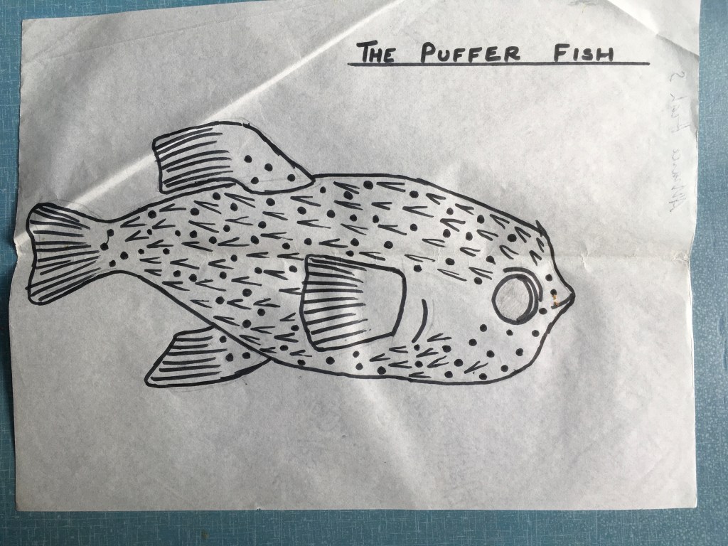 It was the 26th of November when we set off on our long journey to Mombasa. We had gone a 100 miles when Dad turned the van around because the van wasn’t going properly. We were very disappointed, but on the way back through Nairobi we went to the station to buy tickets. The plan was that me, Mummy, Fiona and Juliet should go on the train and Dad should try to get the new parts. The train only went at night so we had to wait another day. At 4 o’clock the next day we got a lift with our friends to the station and waited in the train until it was time to go. When we had passed the industrial area we ate our sandwiches. Our carriage was very nice – there were two seats with backs that hooked up for bunks and a sink with new soap and a mirror. A man came round, later, with blankets but we had to pay 10/- for them (10/- = about 70p). In the morning we looked outside at the beautiful country and about half past eight we came to Mombasa Station. We got a taxi to the Castle Hotel and got a drink each. We then got a bus to Likoni Ferry and went across the mouth of Kilindini harbour where all the big ships go in. At the other side we got some fruit. Then we started on our long 2 mile walk. It does not sound very far but with heavy rucksacks and the sticky heat it was hard going. By the time we got to Amani Cottage it was lunchtime and we were sweating so much that we just got our costumes on and swam in the sea. We stayed 7 days at Amani Cottage swimming, getting sunburnt and just playing. We found thousands of cowries and other shells too but when we went to Watamu we left nearly all of them behind. The first few days we did nothing but swim and enjoy the sunshine. The third day Dad came with the van – he hooted loudly ! The next day we went along to our swimming place and we saw a dead turtle. It’s head was off and you could see it’s vertebrae. Out of both sides blood was dripping out into little pools and the shell was flaky. We guessed it’s head had been battered off. We made a big castle the next day at high tide and just about when the sea was up to it Juliet saw a spiky thing floating in the water. We went to look at it and Juliet said it was a fish. At first I didn’t believe her but it was true it was a fish. Later on we found out that when they have been dead a long time they puff up into the shape of a ball.