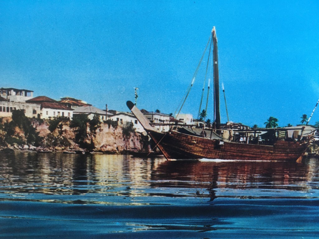 We have just got back from a two week holiday at the coast and find the cold of Kikuyu quite unpleasant so are glad to be going to warmer parts again quickly ! We had a marvellous time at the coast – the children spent hours in the water and even Fiona became quite confident about swimming out of her depth for long periods. The sea is marvellous, very warm and completely clear and smooth inside the coral reef and exciting breakers on the reef itself if one wants a change. Walking on the reef at low tide we were able to see many fish and marine creatures on the pools and rock crevices. We saw something we called ‘land fish’ – 2-4″ long which looked just like fish but lived on the rocks and walked on their two front fins, and an immense variety of crabs. For the second week of our stay we were camping at Watamu which is a Marine National Park, one of several started in an attempt to preserve the reef life which in the main tourist areas near Mombasa is rapidly being ‘collected’ away. We thought you might like the picture of the Arabian dhow. We visited the old harbour at Mombasa where you can still see the dhows which make the crossing from Arabia at the times of year when the wind is right. They are still used commercially but in quite small numbers now. The local fishermen use a smaller version and this is still almost the only form of local boat seen in the reef areas – presumably the fisherman can’t afford an engine and fuel anyway. The only motor boats are the ones used for deep sea fishing by the tourist set-ups.