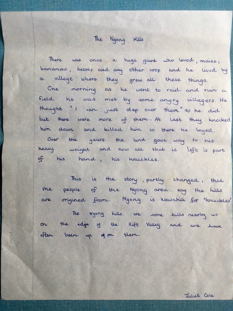 A story about the origin of the Ngong Hills written by Juliet and put in the book we created for Grandma & Grandad for Christmas 1975 –